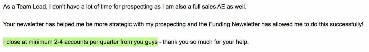 Why? That way, if you perform all of your funding announcement outreach at once, you can simply go through the Weekly Recap and find the most valuable accounts for your outreach.